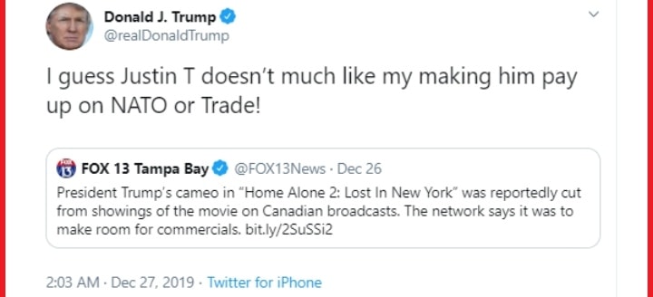 ليعلق مباشرة عبر تويتر وكتب الرئيس الأمريكي تعليقاً على واقعة حذف مشهده “الفيلم لن يكون كما كان في السابق! بالطبع أمزح فقط”، مضيفاً في تغريدة آخري “أعتقد أن جاستن لا يعجبه الطلب الذي قدمته ليدفع ما يتوجب عليه من أجل حلف الناتو أو التجارة”.