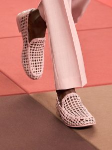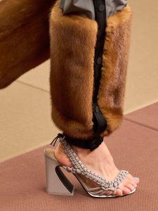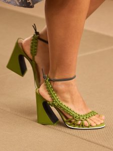 – الأحذية بدت كأنها منحوتات صغيرة: كعوب هندسية، أشرطة ملتفة، وألوان تتراوح بين الذهبي، البيج، والبرتقالي المحروق.