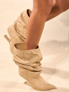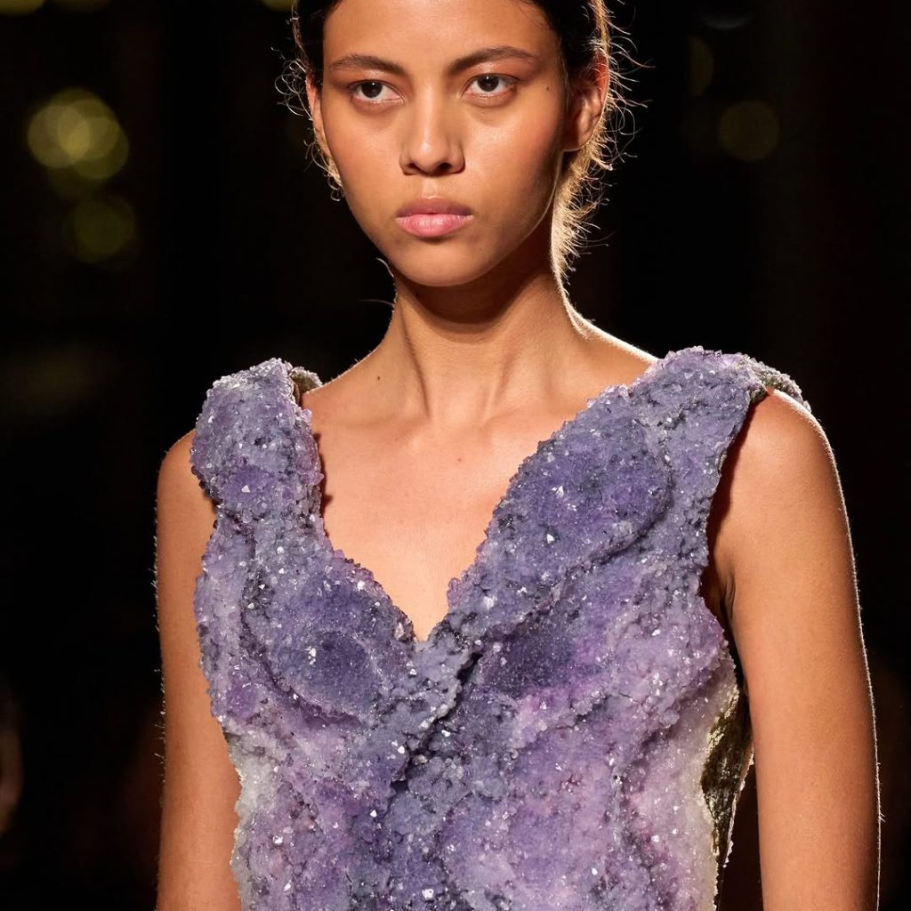 القصّات جاءت مُدرّعة: أكتاف بارزة، هيكلية صارمة، تفاصيل معدنية، وأقمشة مشدودة كأنها تحمي أكثر مما تزيّن. لكن وسط هذه الصلابة، ظهرت لحظات من الرقة: أقمشة شفافة، تطريزات ناعمة، وانسيابية مفاجئة في بعض الفساتين، وكأن العرض يقول إن القوة لا تُلغي النعومة، بل تحتاجها.
