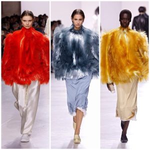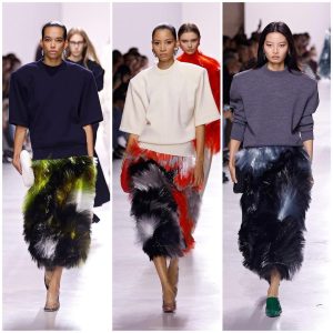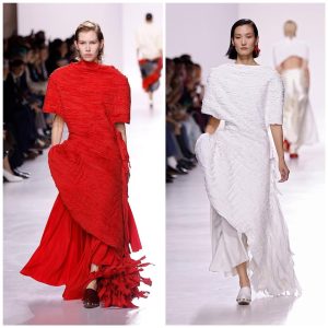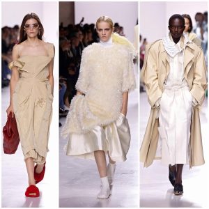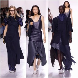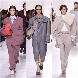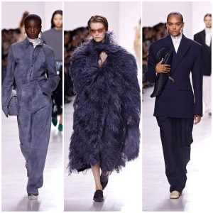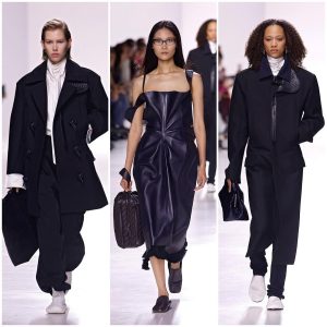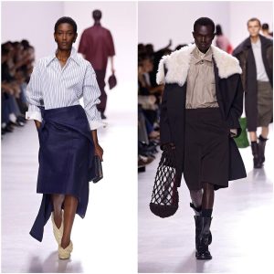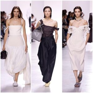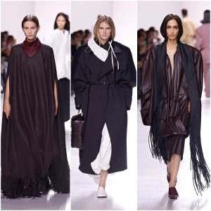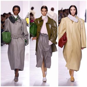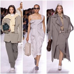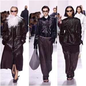 الفساتين جاءت بقصّات منحوتة، والبدلات بأقمشة مطاطية تلتف حول الجسد بانسيابية، مع حضور لافت للجلد المنسوج الذي يُعد توقيع الدار. الألوان تراوحت بين الأخضر الزيتوني، البيج، والرمادي، مع لمسات من الأزرق البحري.