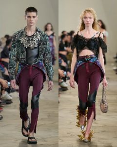 لكن خلف هذا البريق، كانت هناك حكاية عن التمزق والتجميع: بعض القطع بدت كأنها مفككة ثم أعيد تركيبها، وكأن المصمم يقول إن الجمال لا يأتي من الكمال، بل من الحركة، من التغيير، من إعادة تشكيل الذات.