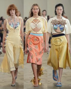 المجموعة استلهمت أجواء البحر والسباحة: توبات الهالتر مستوحاة من البكيني الكلاسيكي، تنورات طويلة مفتوحة من الجانبين، وفساتين مزينة بزهور مطاطية تشبه تلك التي كانت تزيّن قبعات السباحة. الأقمشة تنوّعت بين الساتان، الجلد، والمعدن المجعّد، في توازن بين الحسية والصلابة.
