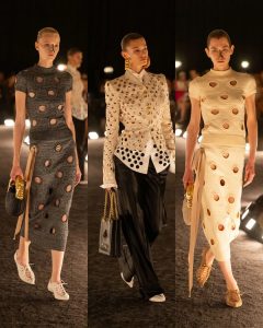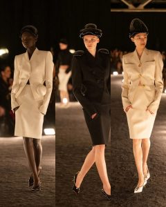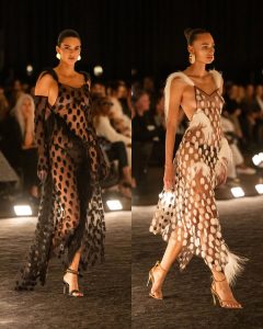 – الفساتين جاءت كأنها منحوتات متحرّكة: أكتاف بارزة، خطوط هندسية، وأقمشة مشدودة كأنها تلتف حول الجسد لتعيد تشكيله.