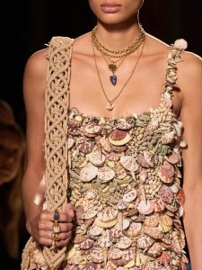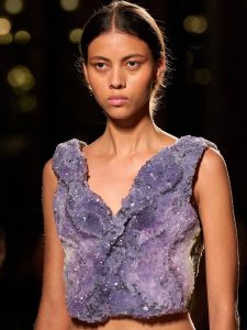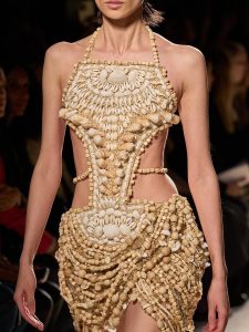 القصّات جاءت مُدرّعة: أكتاف بارزة، هيكلية صارمة، تفاصيل معدنية، وأقمشة مشدودة كأنها تحمي أكثر مما تزيّن. لكن وسط هذه الصلابة، ظهرت لحظات من الرقة: أقمشة شفافة، تطريزات ناعمة، وانسيابية مفاجئة في بعض الفساتين، وكأن العرض يقول إن القوة لا تُلغي النعومة، بل تحتاجها.