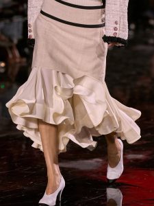 – Blazy أعاد تفسير رموز Chanel مثل التويد، اللؤلؤ، والسترات القصيرة، لكن بأسلوب طبقي ومعماري، حيث كل قطعة بدت كأنها طبقة من الذاكرة تُعاد تشكيلها.