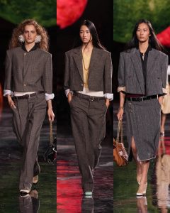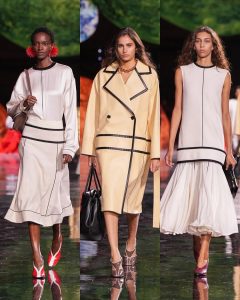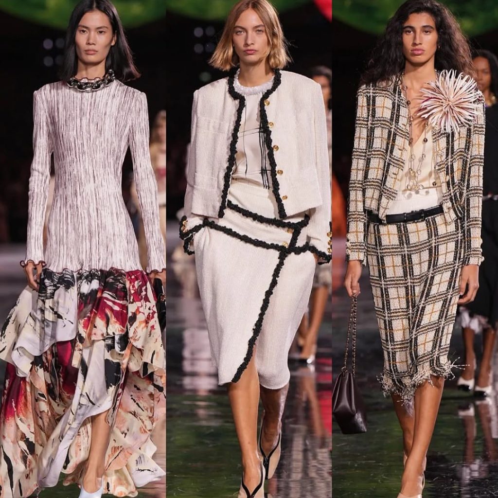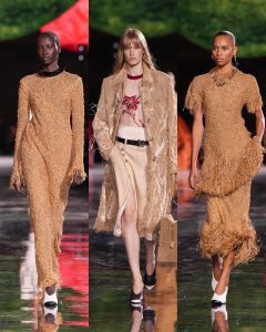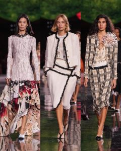 – ظهرت فساتين شفافة، سترات منحوتة، وتنانير مطرّزة، في توازن بين الأنوثة الكلاسيكية والحداثة المفككة.