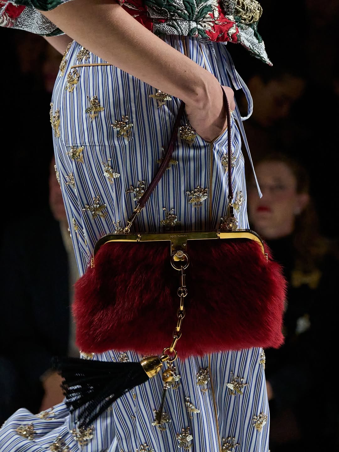 – حقائب صغيرة مزخرفة: ظهرت حقائب يد مصغّرة مرصّعة بالخرز، الدانتيل، أو الزهور ثلاثية الأبعاد، في تحية لأسلوب Alta Moda الفاخر.