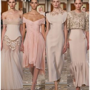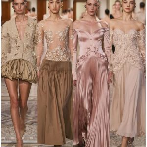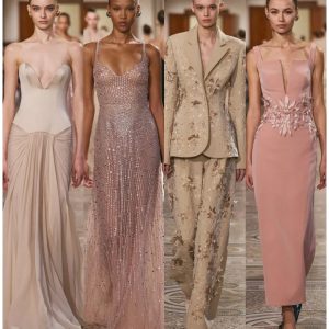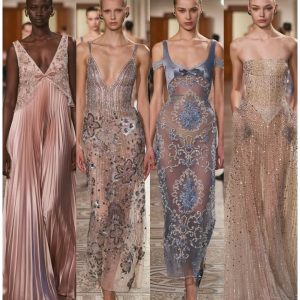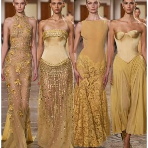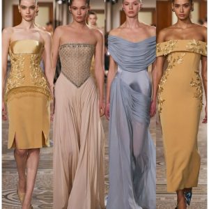 الفساتين جاءت منسابة، مشغولة بتطريزات دقيقة، وأقمشة شفافة تبوح ولا تفضح، وكأن كل قطعة تقول: أنا هنا لأرافقك في يومك، لا لأسرقك منه. الألوان تراوحت بين البيج، الأبيض، الأزرق الباهت، والذهبي الناعم، في انسجام مع فكرة الضوء الذي لا يصرخ بل يضيء.