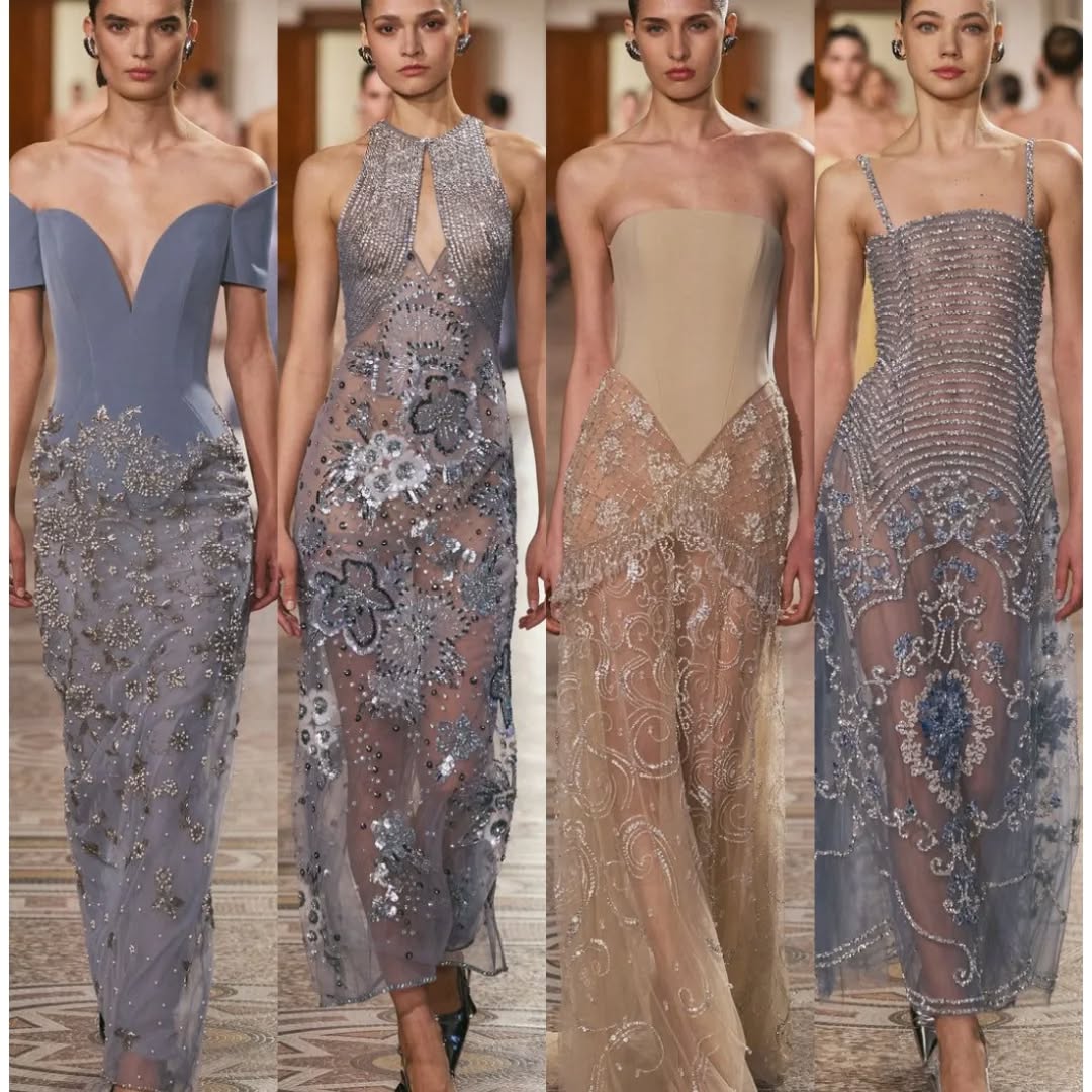 الفساتين جاءت منسابة، مشغولة بتطريزات دقيقة، وأقمشة شفافة تبوح ولا تفضح، وكأن كل قطعة تقول: أنا هنا لأرافقك في يومك، لا لأسرقك منه. الألوان تراوحت بين البيج، الأبيض، الأزرق الباهت، والذهبي الناعم، في انسجام مع فكرة الضوء الذي لا يصرخ بل يضيء.