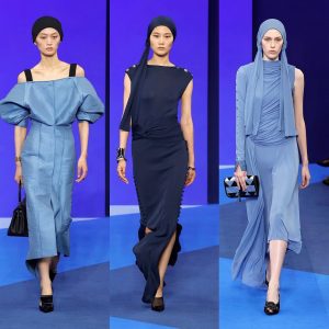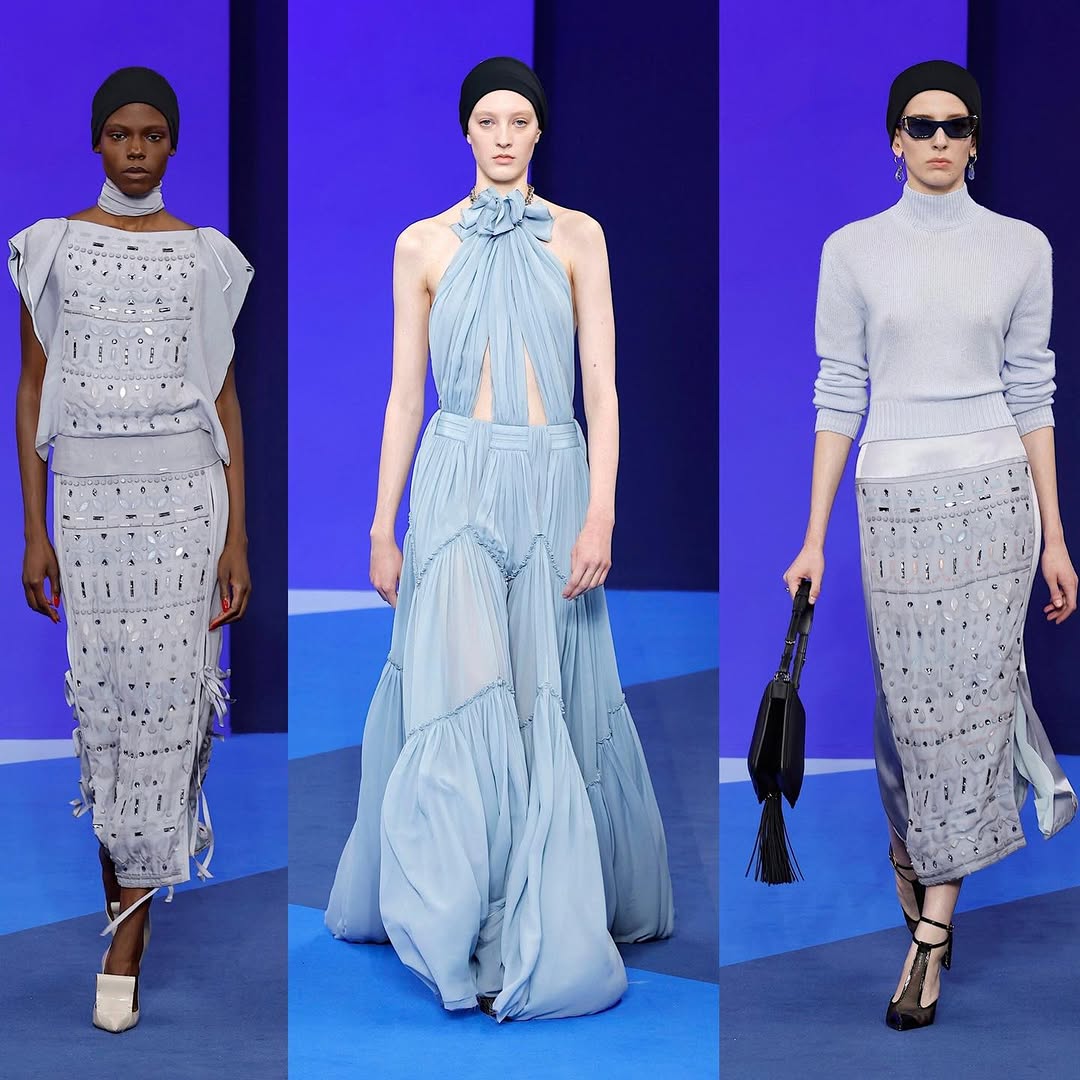 القصّات جاءت منحوتة لكن مرنة: سترات قصيرة بأكتاف محددة، فساتين طويلة تنساب كالماء، وتفاصيل غير متوقعة كالأكمام المنفوشة أو الفتحات الجانبية التي تكشف دون أن تفضح. الألوان تراوحت بين الأسود، الأبيض، الأزرق الليلي، والذهبي الباهت، وكأنها تلتقط الضوء من زوايا مختلفة.