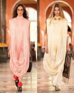 – القصّات جاءت متعددة الطبقات، كأنها تحاكي السفر بين العصور: سترات قصيرة فوق فساتين طويلة، أكمام قابلة للفصل، وتفاصيل مستوحاة من أزياء الفرسان والرحّالة.