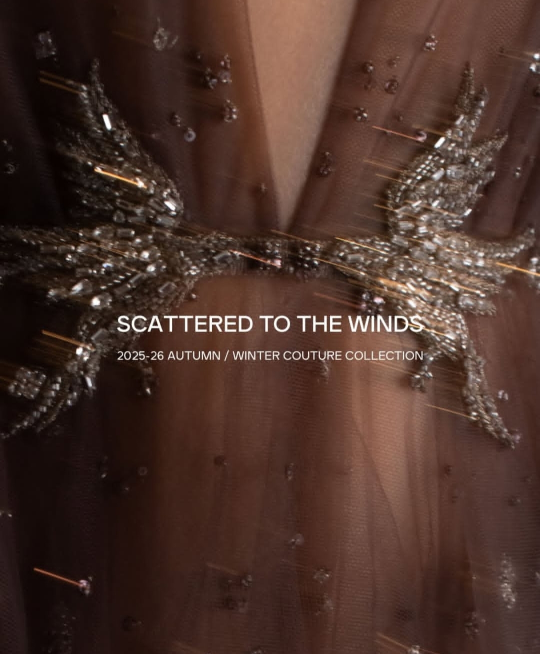 باولو سيباستيان قدّم في خريف وشتاء 2025-2026 مجموعة كوتور بعنوان “Scattered to the Winds”، مستوحاة من فكرة التحرر والبحث عن الذات. الفساتين جاءت حالمة، بأقمشة شفافة وتطريزات دقيقة، وألوان ناعمة مثل النعناع والبيج. التصاميم تحاكي قصة امرأة ترفض القيود وتختار الحرية بجمال راقٍ وشاعري.