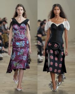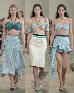 المجموعة استلهمت أجواء البحر والسباحة: توبات الهالتر مستوحاة من البكيني الكلاسيكي، تنورات طويلة مفتوحة من الجانبين، وفساتين مزينة بزهور مطاطية تشبه تلك التي كانت تزيّن قبعات السباحة. الأقمشة تنوّعت بين الساتان، الجلد، والمعدن المجعّد، في توازن بين الحسية والصلابة.