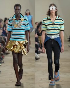 الألوان كانت مشبعة بالحياة: الخوخي، الأصفر، الأزرق البحري، والفضي، مع لمسات من الأحمر والذهبي. حتى الإكسسوارات بدت كأنها امتداد للمشهد الساحلي: حقائب تشبه قشور السمك، نظارات ضخمة مستوحاة من معدات الغوص، وأحذية مزينة بأوراق معدنية وكأن العارضات يسرن فوق بساط من النخيل.