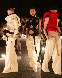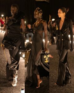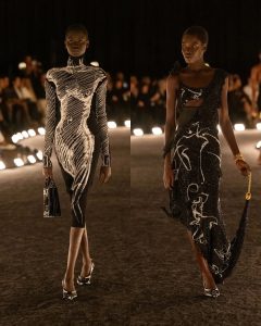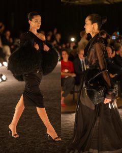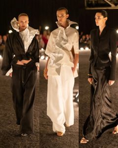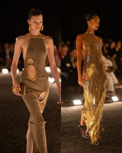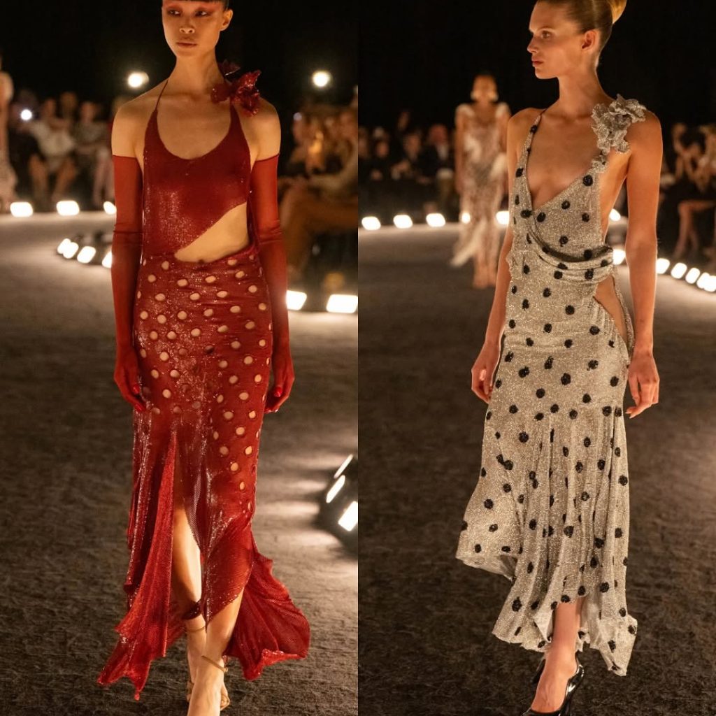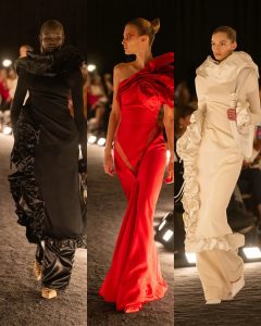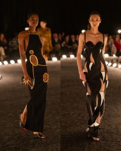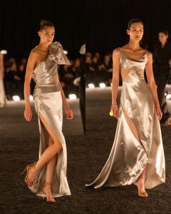 – الفساتين جاءت كأنها منحوتات متحرّكة: أكتاف بارزة، خطوط هندسية، وأقمشة مشدودة كأنها تلتف حول الجسد لتعيد تشكيله.