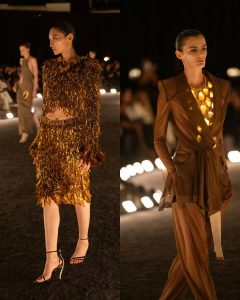 – اللون الذهبي كان نجم العرض، إلى جانب الأبيض، الأسود، والبيج، في توازن بين الفخامة والصفاء.