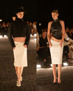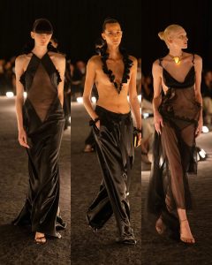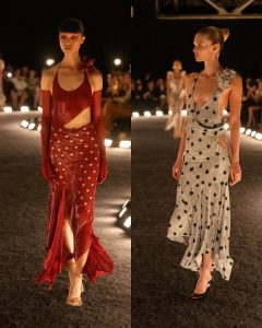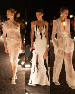 – الفساتين جاءت كأنها منحوتات متحرّكة: أكتاف بارزة، خطوط هندسية، وأقمشة مشدودة كأنها تلتف حول الجسد لتعيد تشكيله.